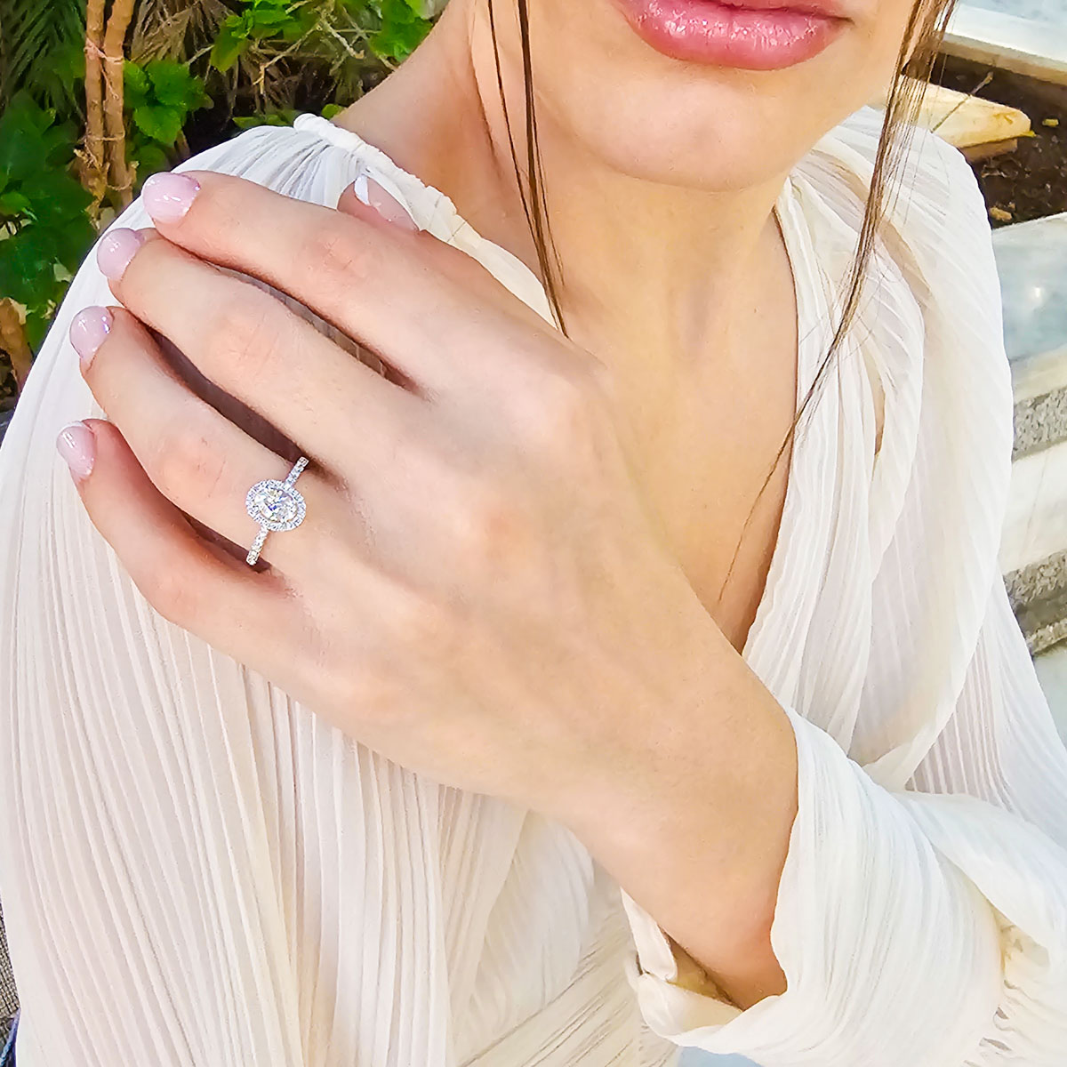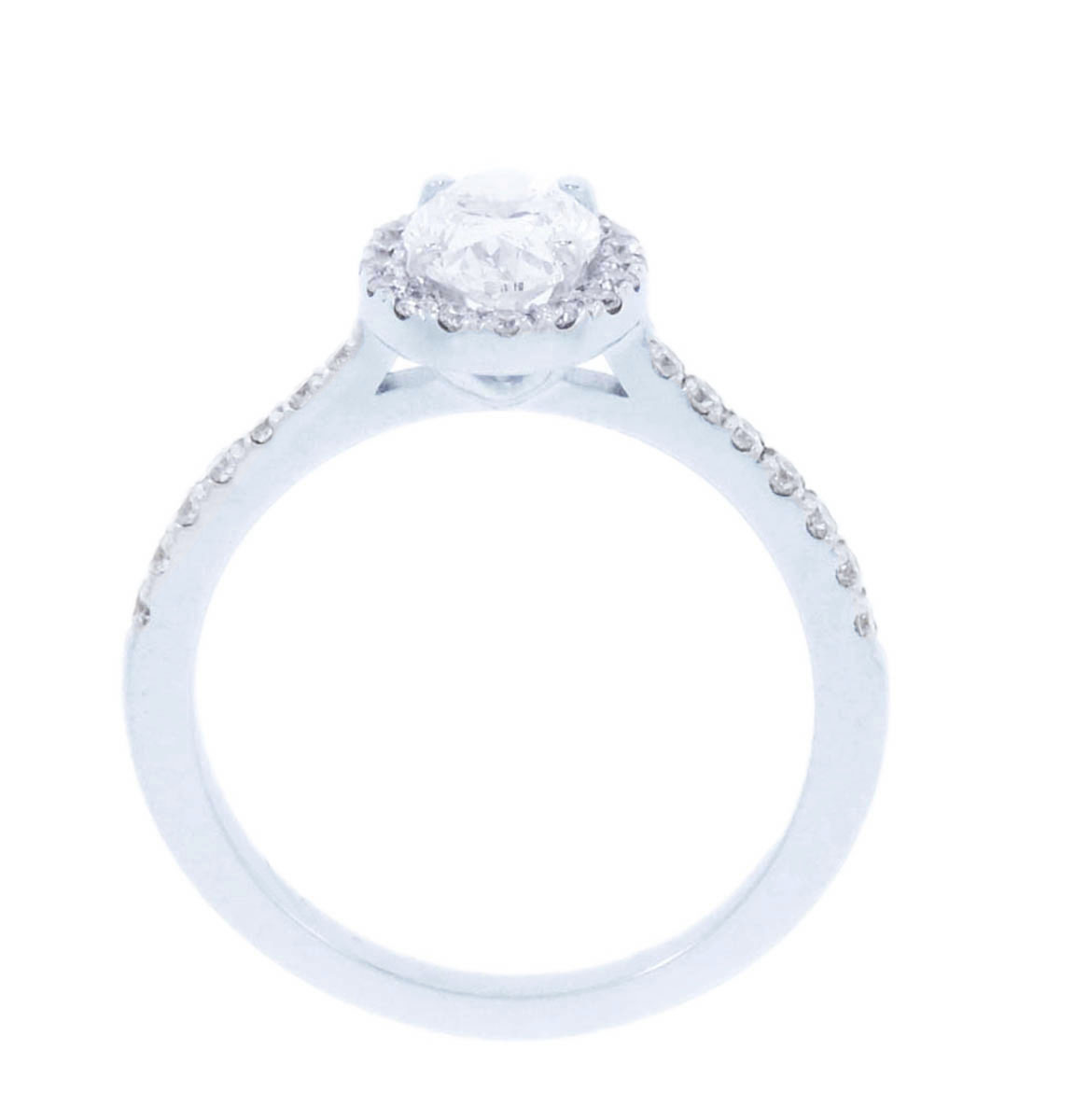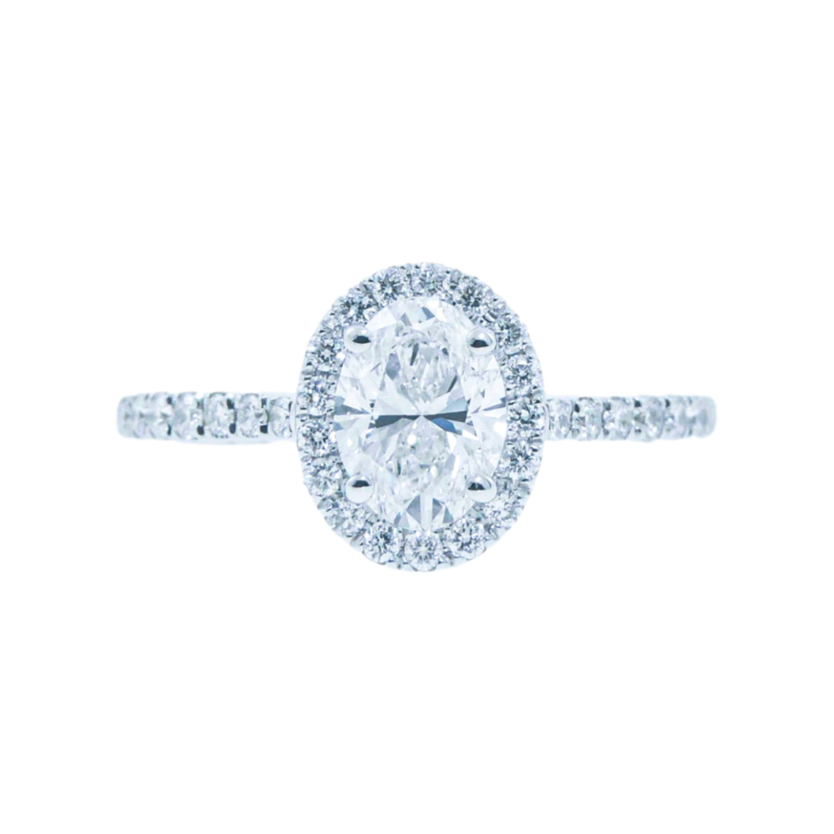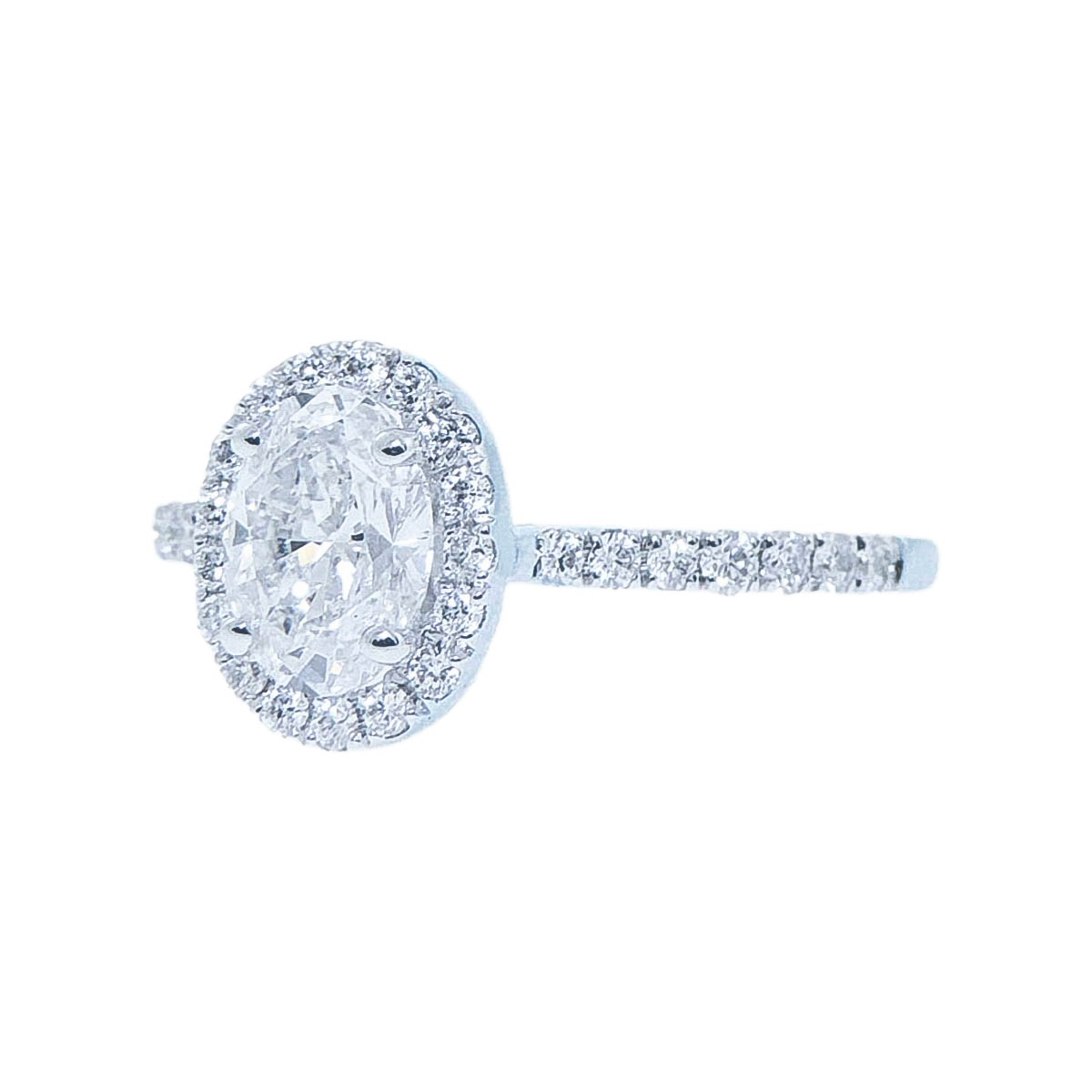 Discover timeless elegance with this stunning gold and 0.90ct oval diamond halo engagement ring crafted in 18K white gold. Featuring a beautifully cut oval diamond centerpiece surrounded by shimmering round brilliant cut accents, this ring offers a perfect blend of sophistication and sparkle.