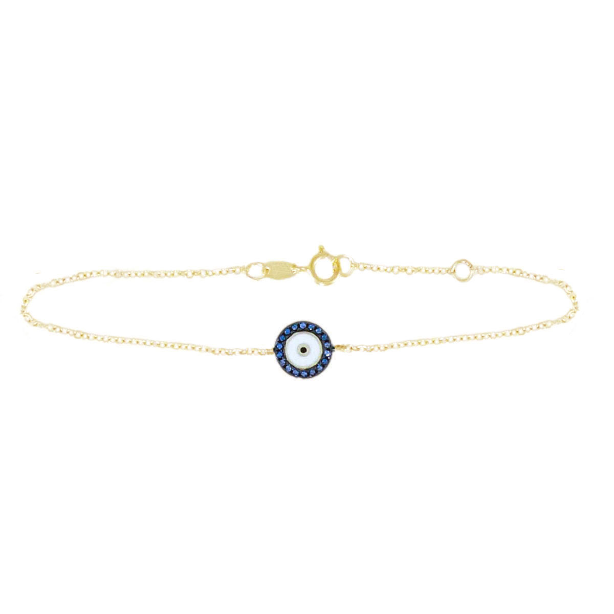 Discover the elegance of our gold and blue cubic zirconia evil eye bracelet crafted in 14K yellow gold. Featuring sparkling blue cubic zirconia gemstones in a captivating evil eye design, this bracelet offers a stylish and protective accessory for everyday wear. The vibrant blue stones contrast beautifully against the warm gold setting, creating a striking and meaningful piece. Perfect for adding a touch of sophistication to any outfit, this bracelet seamlessly combines symbolism and style. Elevate your jewelry collection with this eye-catching piece that embodies protection and elegance.