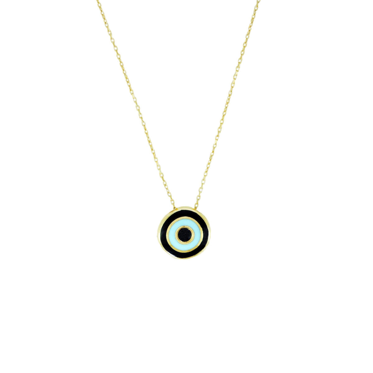 Discover the captivating allure of our gold cubic zirconia and enamel evil eye necklace crafted in 14K yellow gold. This striking piece features sparkling cubic zirconia gemstones with brilliant cuts that mimic the beauty of diamonds, surrounded by vibrant enamel accents for a bold, protective symbol. Designed to add a touch of elegance and cultural significance to any ensemble, this necklace effortlessly combines craftsmanship and style. Perfect for everyday wear or special occasions, it offers a unique blend of tradition and modern sophistication. Elevate your jewelry collection with this meaningful and eye-catching accessory. With the distinction of John Lyras certification.