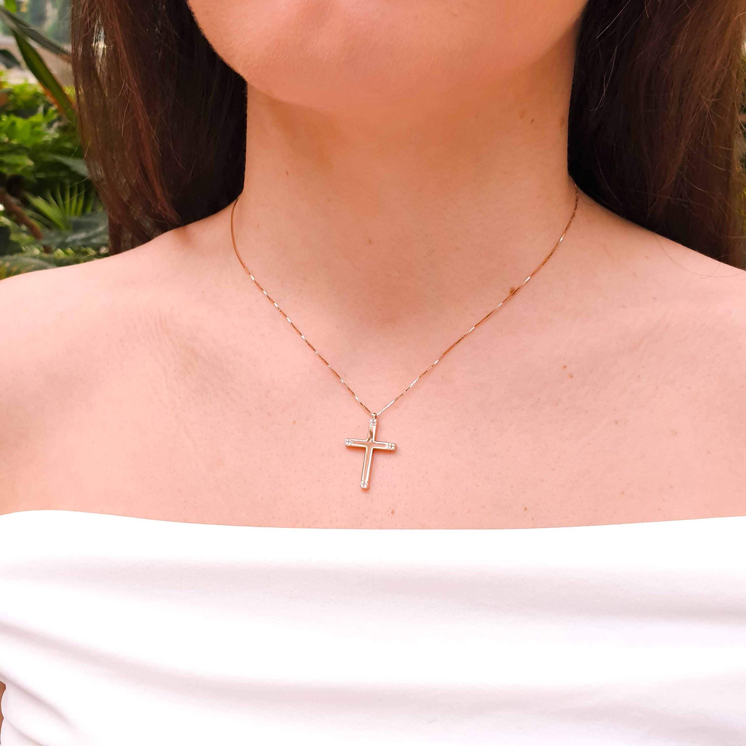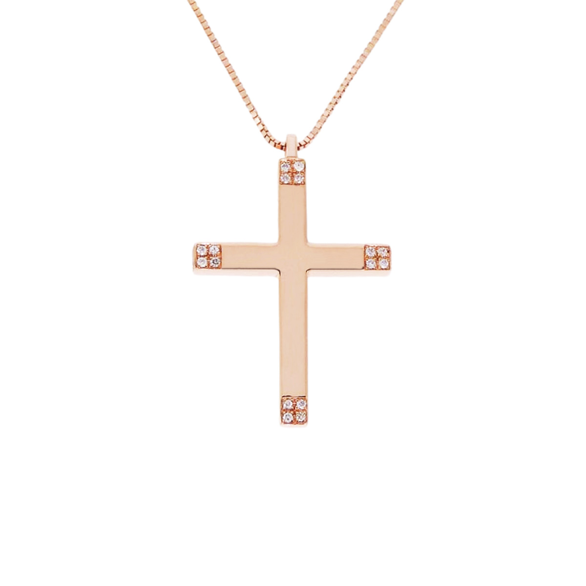 Discover the timeless elegance of this gold and diamond cross and chain, crafted from luxurious 18K rose gold. The chain features a delicate design that complements the striking cross pendant, which is adorned with round brilliant cut diamonds. The combination of warm rose gold and sparkling diamonds creates a sophisticated and versatile piece perfect for everyday wear or special occasions. This jewelry seamlessly blends classic charm with modern style, making it a meaningful addition to your collection or a thoughtful gift for someone special. Elevate your jewelry collection with this exquisite piece of craftsmanship and elegance