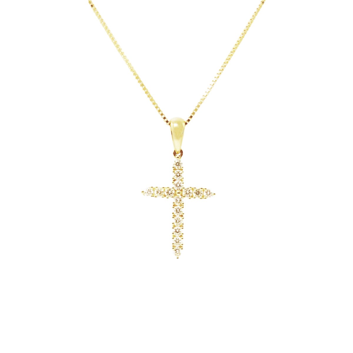 Discover timeless elegance with our gold diamond cross and chain, crafted from radiant 18K yellow gold. This exquisite necklace features a beautifully detailed cross adorned with sparkling round cut diamonds that capture and reflect light perfectly. The lightweight chain complements the pendant, creating a sophisticated and versatile piece suitable for everyday wear or special occasions. Crafted with high-quality materials and expert craftsmanship, this jewelry combines luxury and faith in a stunning design. Elevate your collection with this elegant gold diamond cross and chain, a perfect symbol of style and spirituality. With the distinction of John Lyras certification.