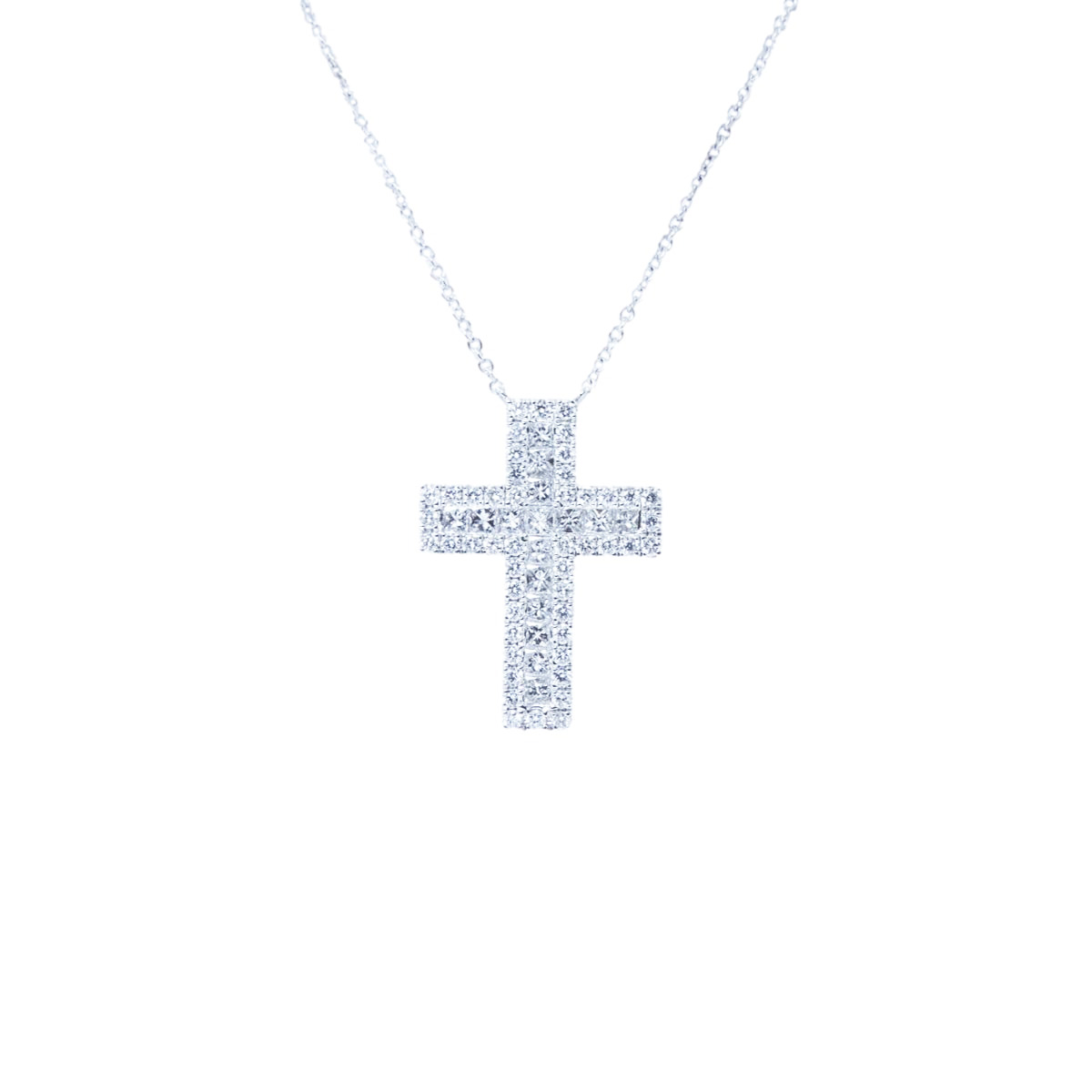 Discover the timeless elegance of our gold diamond cross and chain, crafted from luxurious 18K white gold. This exquisite piece features a beautifully detailed cross adorned with shimmering round brilliant cut diamonds that capture and reflect light with every movement. The delicate chain complements the cross perfectly, creating a sophisticated and versatile accessory ideal for everyday wear or special occasions. Made with high-quality materials, this jewelry piece combines classic design with modern craftsmanship, making it a meaningful gift or a treasured addition to your collection. Elevate your style with this stunning statement piece. With the distinction of John Lyras certification.