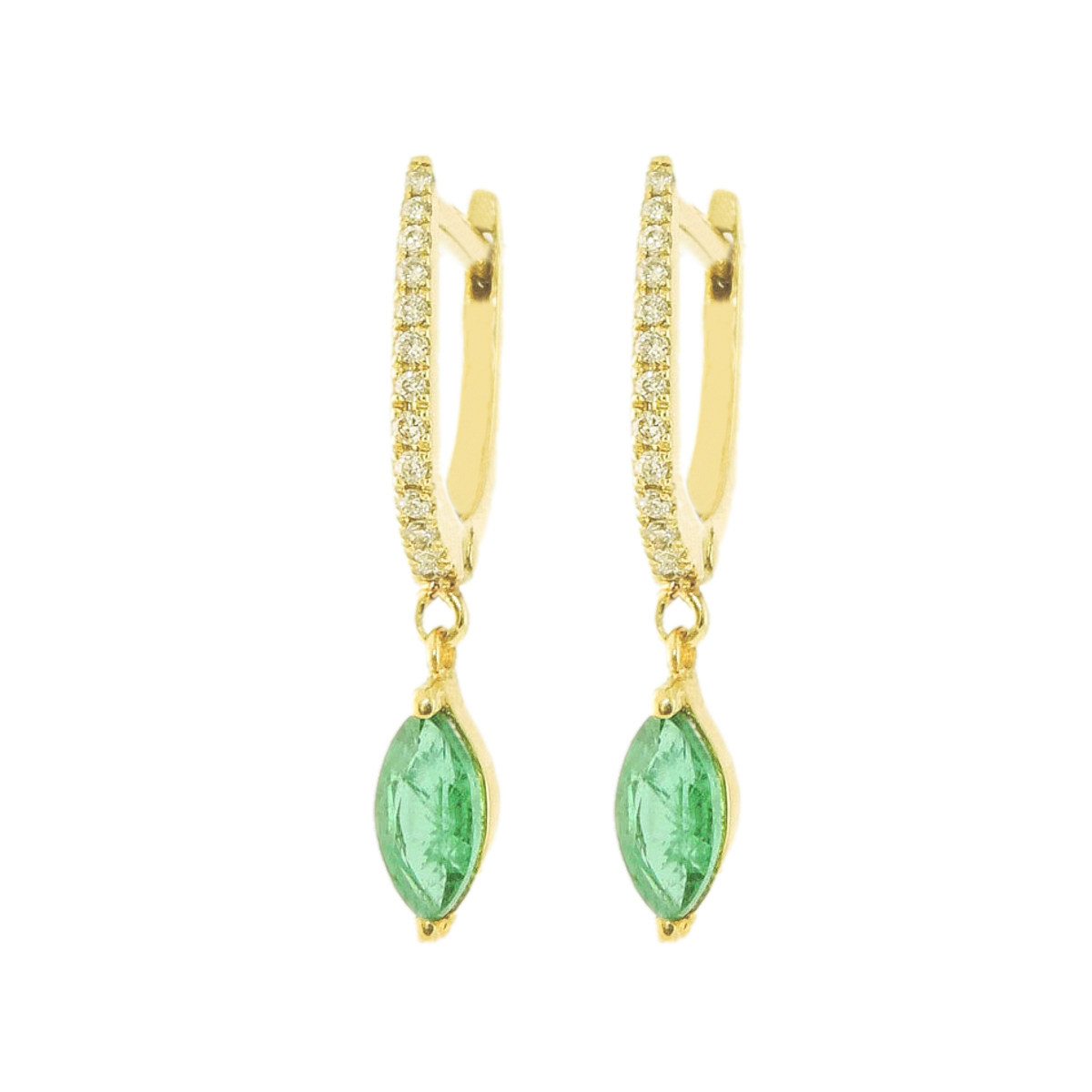 Adorn your ears with these exquisite gold, emerald and diamond huggies crafted from 18K yellow gold. Featuring vibrant emeralds and sparkling diamonds, these earrings showcase a stunning combination of vivid green gemstones and shimmering clear stones. Designed in a comfortable huggie style, they add a touch of elegance and sophistication to any ensemble. Perfect for both everyday wear and special occasions, these earrings effortlessly blend timeless beauty with modern charm. Elevate your jewelry collection with these captivating gold, emerald and diamond huggies that embody luxury and style. With the distinction of John Lyras certification.