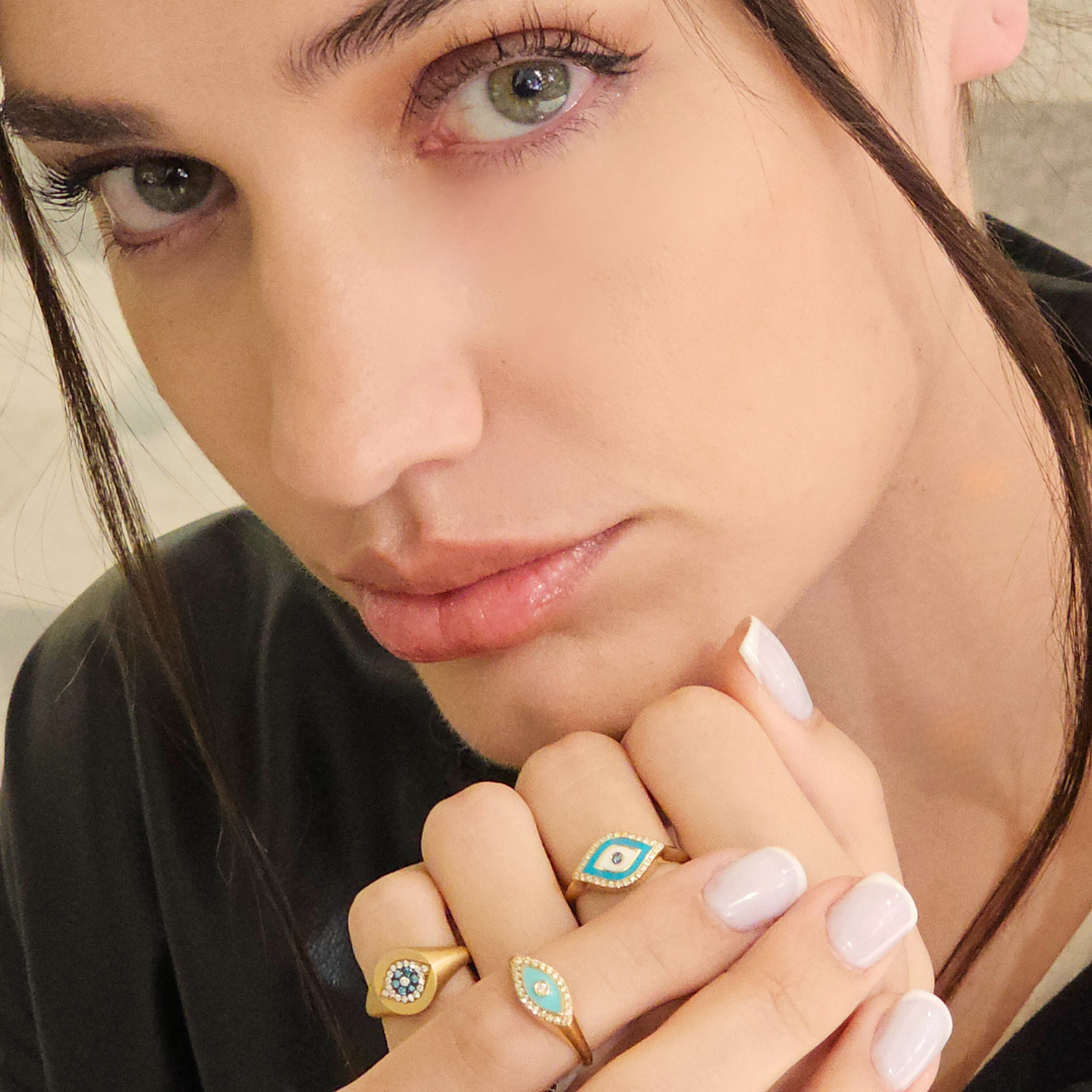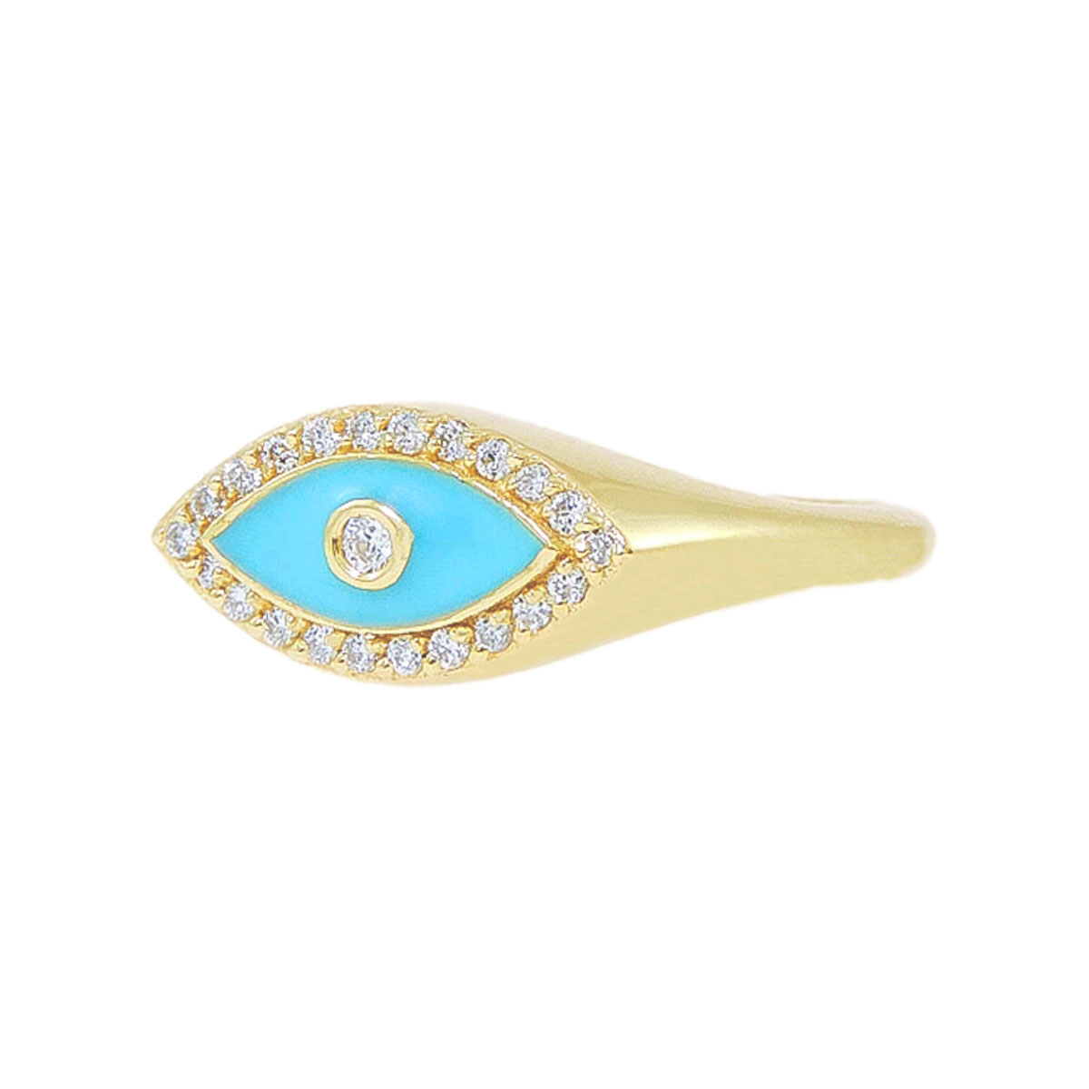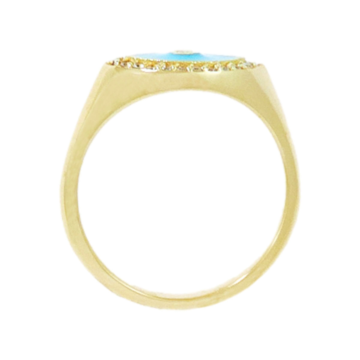 Discover the captivating allure of this gold, enamel, and diamond evil eye ring crafted in 18K yellow gold. Featuring intricate enamel work in vibrant colors, it beautifully symbolizes protection and good fortune. Adorned with sparkling round-cut diamonds, the ring adds a touch of elegance and brilliance. Its bold design makes it a perfect statement piece for everyday wear or special occasions. Crafted with meticulous attention to detail, this evil eye ring combines cultural symbolism with luxurious craftsmanship. Elevate your jewelry collection with this unique and meaningful accessory that seamlessly blends tradition and modern style. With the distinction of John Lyras certification.