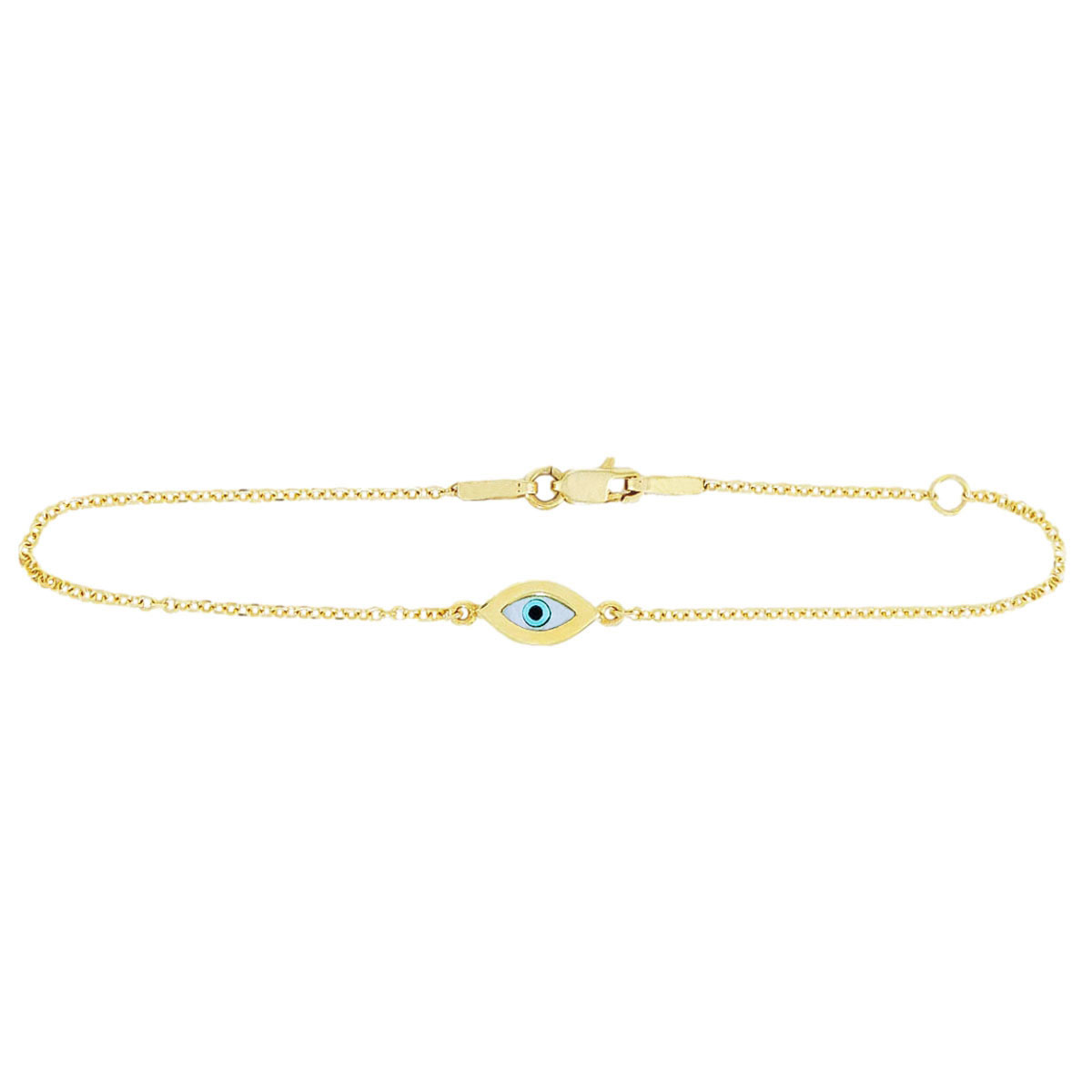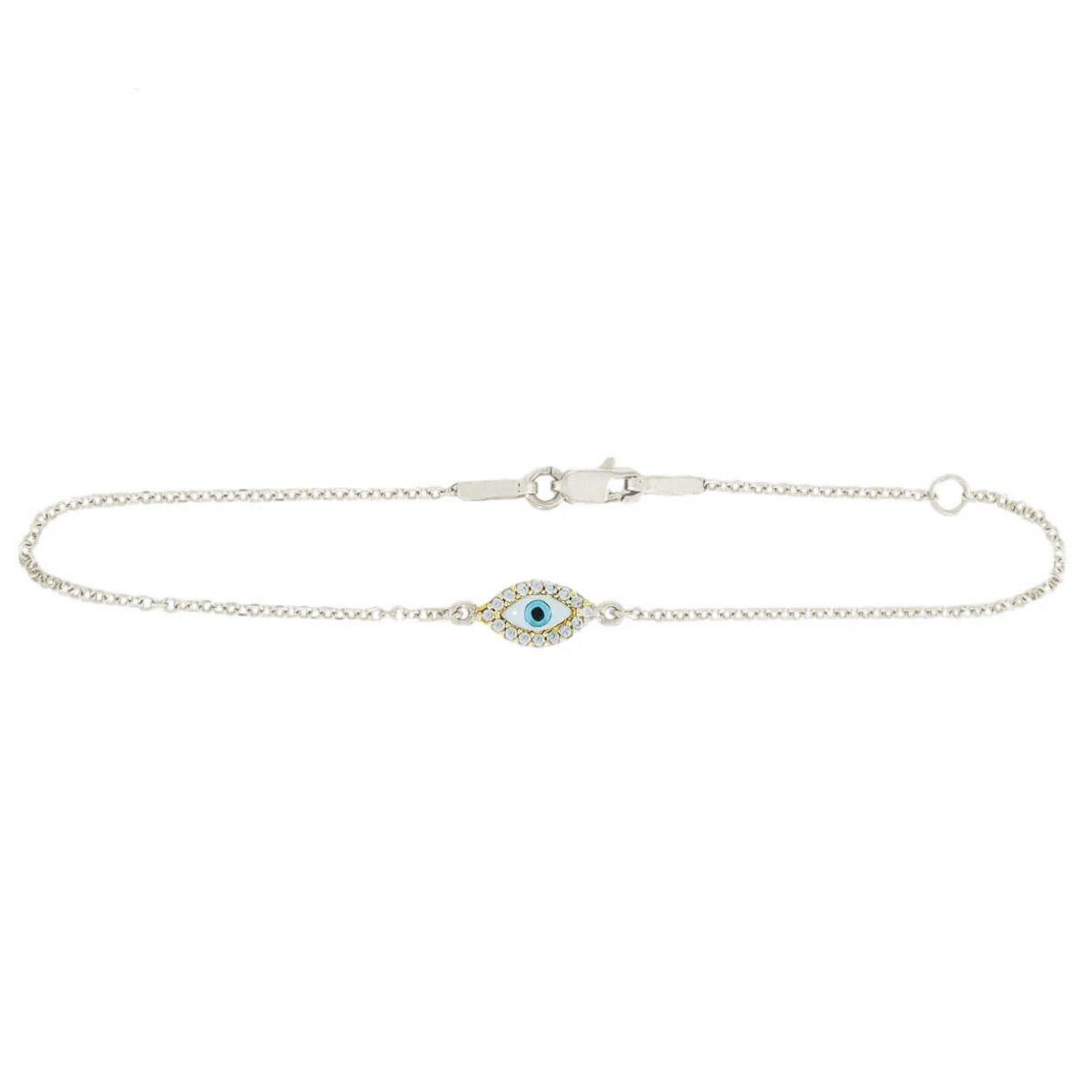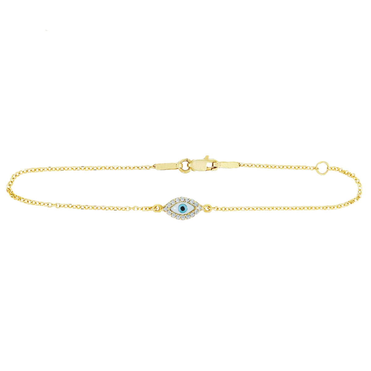 Discover the beauty and protection of our gold evil eye bracelet, available in white gold or yellow gold, crafted in 14K for lasting elegance. Featuring luminous mother of pearl and sparkling cubic zirconia, this bracelet combines timeless charm with meaningful symbolism. The evil eye design is believed to ward off negative energy, making it a perfect accessory for daily wear or special occasions. Its delicate craftsmanship and versatile style seamlessly complement any outfit. Elevate your jewelry collection with this stunning piece that embodies protection, elegance, and modern sophistication. With the distinction of John Lyras certification.