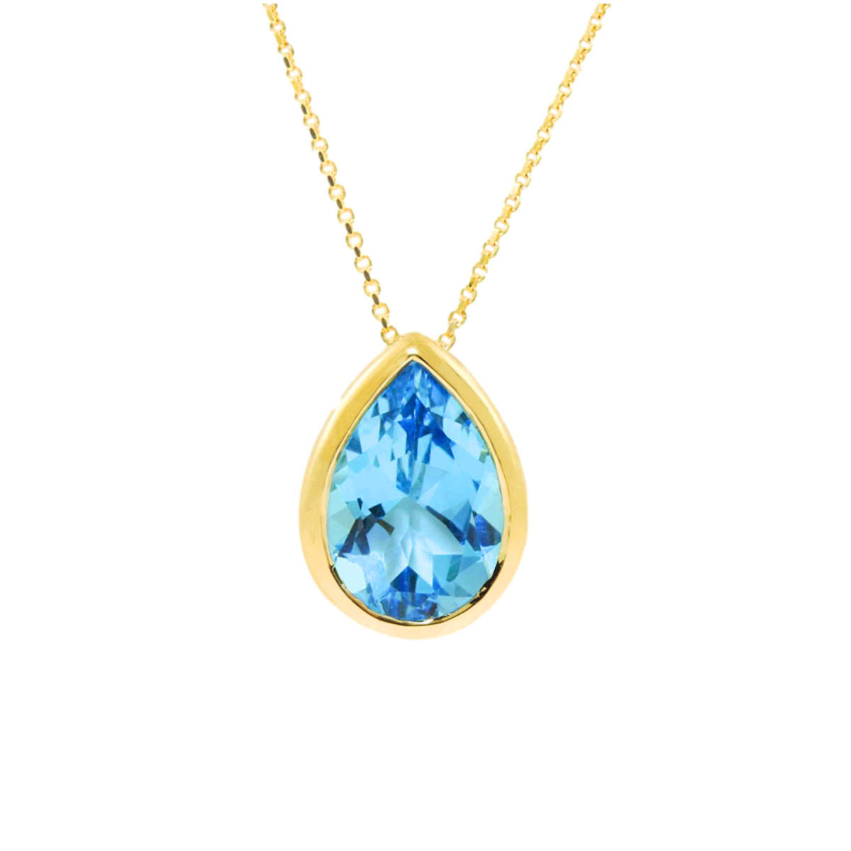 Discover the allure of this stunning necklace featuring a pear-shaped blue topaz gemstone set in radiant 14K yellow gold. Crafted with precision, the necklace showcases a beautifully cut blue topaz that captures and reflects light with every movement.