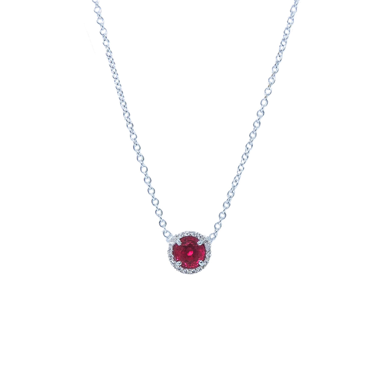 Discover timeless elegance with this stunning halo necklace crafted from 18K white gold. Featuring a captivating central ruby surrounded by a delicate halo of sparkling diamonds, this piece exudes sophistication and charm.